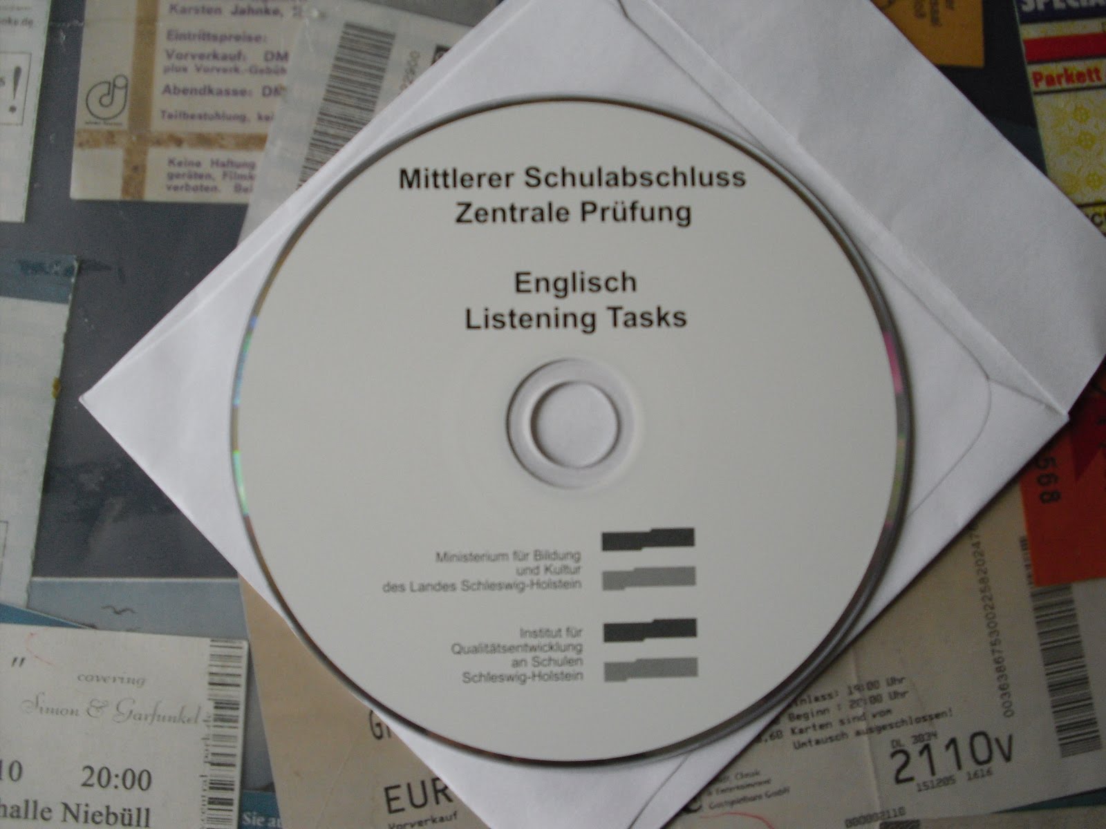Here's a little preview of what tomorrow "stressed-poor" to the students the 10th Classes belongs: the test book and with listening tasks "CD of the final written thesis in English have been given to us today! A short time later it came out the first correction-mail Kiel, who pointed out an error ... We hope that this will be the last. The CD is complete, ie, both listening texts are there! Now it is the 15 minutes that are available to fill, as closely as possible with creative content! I can only say: GOOD LUCK AND DO YOUR VERY BEST!